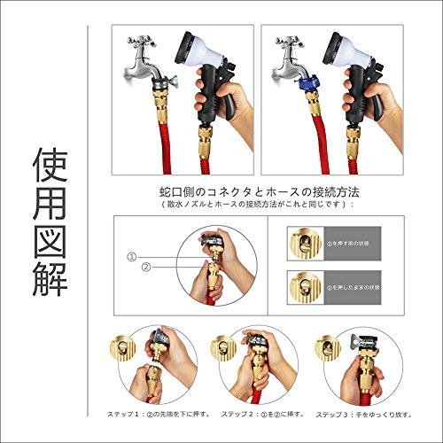 - パッケージ内容: ホース、散水ノズル、 銅製コネクタ、青い予備コネクタ、シールテープ