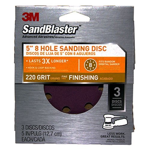 Heavy fiber backing for strong and durable long life. 5-Inch, 8 hole. 220 Grit, final sanding. 3M SandBlaster Sanding Discs 9525ES, 5 in by 8Hole, 220 grit, 3-Pack. SandBlaster discs are ideal for use on many surfaces, including wood, metal, and fiberglass. SandBlaster discs were designed especially for high speed power tool sanding.The fine (220 grit) sanding discs were specially developed for final sanding. The heavy duty fiber backing is coated with extremely durable Cubitron mineral, which outperforms our conventional sanding discs because it stays sharp, resulting in a more consistent sanded surface and a longer disc life.