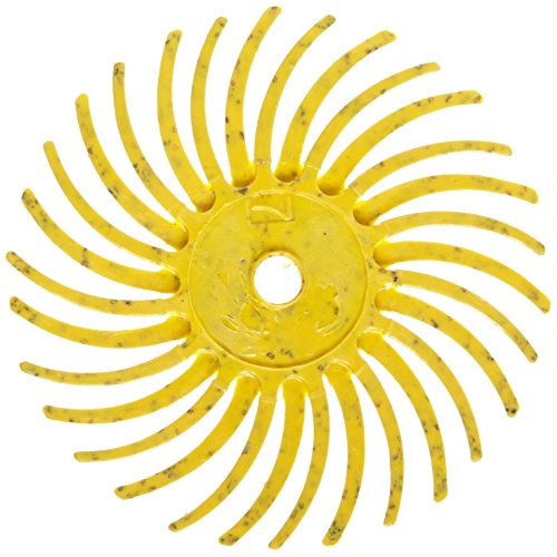 Yellow color. 3M Scotch-Brite radial bristle disc bristle. Durable radial plastic disc for deburring or coating removal. Leaves a satin finish. Gang multiple discs to form a brush. Fits portable hand tool or small bench motor. Abrasive mineral: 80 grade Cubitron grain. Consistent supply of abrasives. Clean and strips with light pressure. Great for contours and hard-to-reach areas. Converted form: bristle disc. Equipment - machines: die grinders. Grade: 80. Max RPM: 35000. Size: 3/4-inches diameter. Center hole diameter: 1/16-inches. Yellow color. Position: best. Mineral type: ceramic.