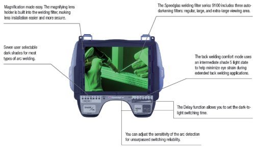 - Auto darkening filter (ADF) transitions from light to dark shade in approximately .1 milliseconds after welding arc is detected