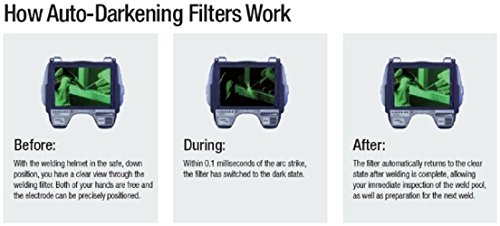 - Auto darkening filter (ADF) transitions from light to dark shade in approximately .1 milliseconds after welding arc is detected