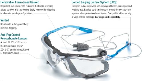 Comfortable, lightweight frame;The Cord Control System (CCS) with optional foam gasket attachment;Meets the requirements of CSA Z94.3-07;Impact rated to ANSI Z87.1-2010;CCS is designed to keep a corded earplug attached, untangled, and ready for use