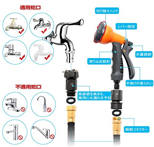 - 2016最新改良版モデル、破損や破裂は難しくなり、磨耗と高圧への耐久性が高い。熱や耐久性に強い、強化ゴムを採用した伸びるホース。