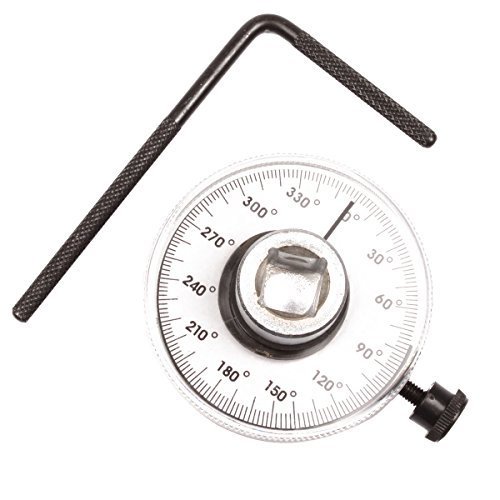 1/2インチドライブを使って作業するラチェットハンドル。読みやすい角度目盛り付きの文字盤です。TTYファスナーを使用している最近のモデルエンジンの多くを点検する時に必要です。トルク角のアプリケーションで、プレトルク後の回転角度を測定します。360度の1目盛りは2度刻みで、10度おきの印と30度ごとに数表示されています。ハウジングを回して簡単にゼロにリセットできます。1/2インチのオスとメスのスクエアドライブがついています。