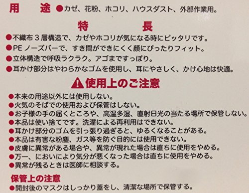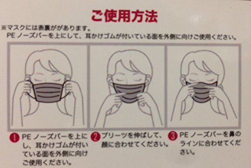 ※本品は有毒ガス、有害粉塵を防ぐ目的での使用はできません 寸 法: 90mm×145mm 性 能: 不織布3層構造 (BFE:平均99%カット) 内容量: 60枚入り 材質:本体(ポリプロピレン不織布)/ノーズバー(ポリエチレン)/耳ゴム(ポリウレタン) 特徴 ●ポリエチレンノーズバーでしっかりフィット ●口元に空間ができて呼吸もラクラク ●やわらかなゴムで耳にやさしい付け心地 ●ゴムを外側で固定し、頬にやさしくフィット 使用方法 ●PEノーズバーを上にし、 耳かけゴムがついている面を外側に向けご使用ください。 ●プリーツを伸ばして、顔に合わせてください。 ●PEノーズバーを鼻のラインに合わせてください。 ※開封後のマスクはしっかり蓋をし、 清潔な場所で保管する。