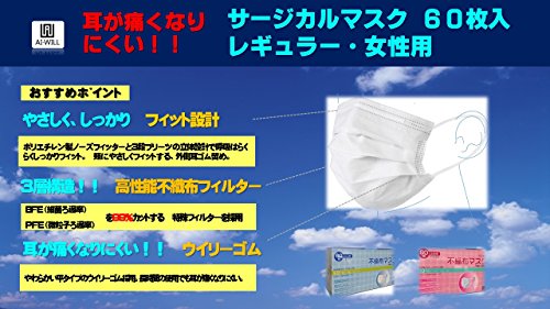AI-WILL 快適 使い捨てサージカルマスク 女性用 50枚+10枚増量【PFE BFE 99%カットフィルター】花粉対策に!!