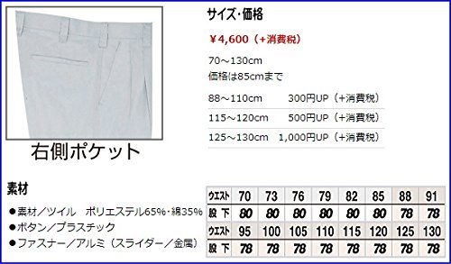 商品詳細 素材:ツイル,綾織り,ポリエステル65%,綿35%,帯電防止 右側ポケット サイズ ウエスト:股下(単位:cm) 【70】70:80 【73】73:80 【76】76:80 【79】79:80 【82】82:80 【85】85:80 【88】88:78 【91】91:78 【95】95:78 【100】100:78 【105】105:78 【110】110:78 【115】115:78 【120】120:78 【125】125:78 【130】130:78