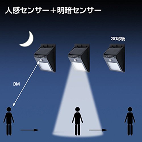 - 人感センサーで、人の動きを感知すると自動的にフル点灯し、30秒前後で微光に戻るので、防犯ライトとして使える!