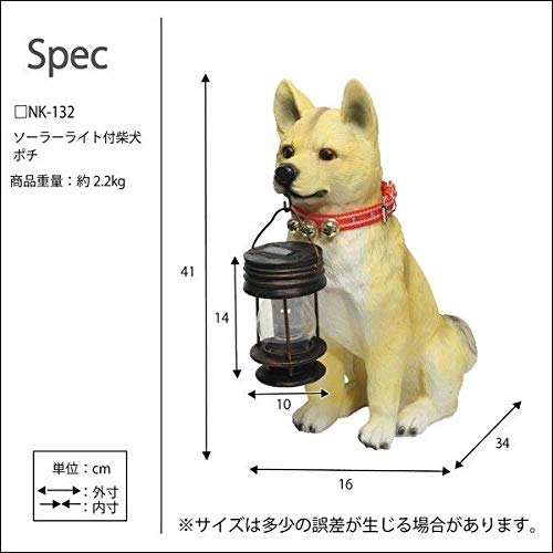 - く、置物としても存在感抜群です◎ ◎お客様の声◎ ・犬が飼えない環境でさみしい思いをしていましたが、 「ポチ」が来てからは元気をもらっています! ・ふんわりやさしいライトの光が癒されます! ※ライト部分はアンティーク調仕様のため、塗装にムラがございます。 ○●タイプ違いの柴犬もオススメ●○ NK-131 ソーラーライト付柴犬(タロー) ●商品名 ソーラーライト付柴犬(ポチ) ●サイズ 商品サイズ(約):幅16×奥行34×高さ4