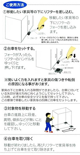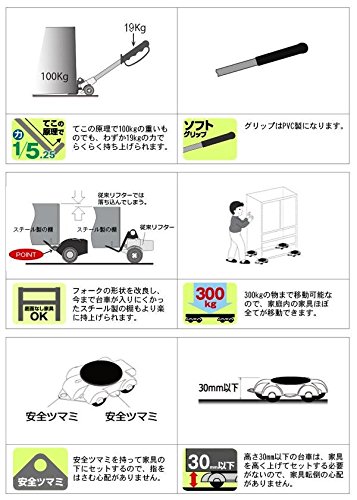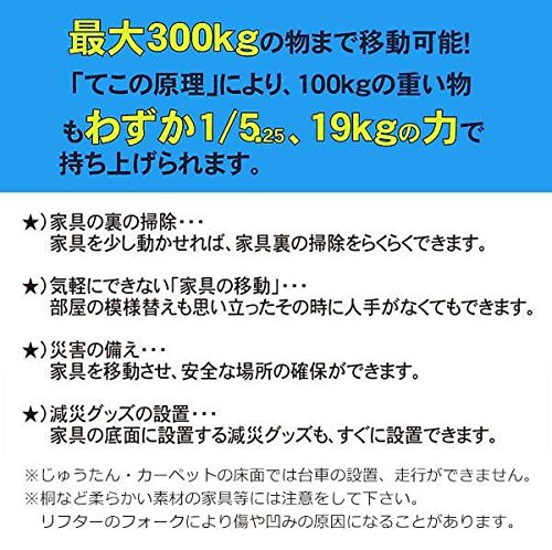 - 重たい家具等の持ち上げと移動がひとりでラクラク 「家具を移動しよう!!」と思い立っても、力仕事の家具の移動はおっくうです。暮らしの中の「小さな困りごと」のひとつかもしれません。そこでこのらくらくヘルパー☆てこの原理で重い物もラクラク移動可能!!最大300kgの物まで移動できますので、家庭内のほとんどの家具に対応します。 サイズ 【スマートリフター】67×320×44mm、【スマート台車】80