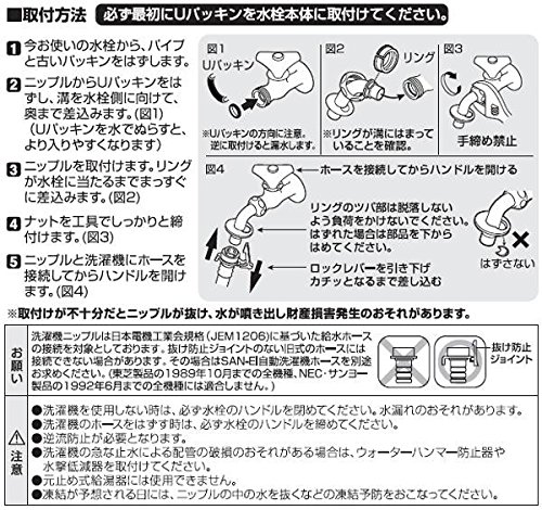 - のL型ニップルです。 【使用上の注意】 洗濯機用ニップルを混合栓に使用される場合には、逆流防止のため、逆流防止弁付の器具あるいは湯、または水のみでご使用ください。 抜け防止ジョイントのない旧式のホースには接続できない場合があります。 洗濯機ホースをワンタッチで接続します。 fk09