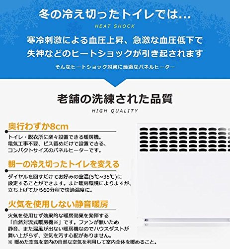- 寒冷刺激による血圧上昇、急激な血圧低下で失神などのヒートショック対策に、トイレ・脱衣所に楽々設置できるコンパクトサイズのパネルヒーター。 fk094igrjs