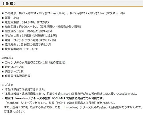 - チャイムです。 扉の開閉を感知して、離れた場所に光と音でお知らせします。ID学習式で、混線を防止します。「monban」(型番OCH-M)シリーズの受信機とセットでお使いください。 fk094igrjs