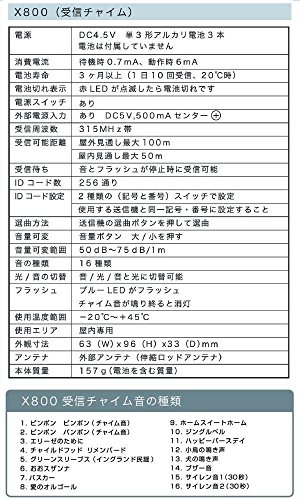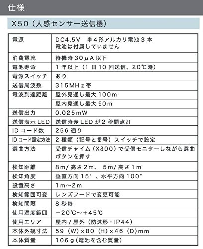 - 人や動物の動き(熱)を感知して離れた場所に光と音でお知らせ 来客時のお知らせや、徘徊するお年寄りの検知に。人や動物の動き(熱)を感知し、離れた場所にある受信機に光やチャイム音でお知らせします。※受信機(X800)・送信機(X50)ともに電池は付属しておりません。 サイズ 個装サイズ:23×16×6cm 重量 個装重量:350g 素材・材質 ABS樹脂