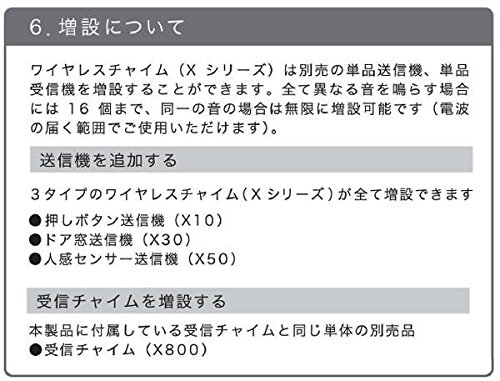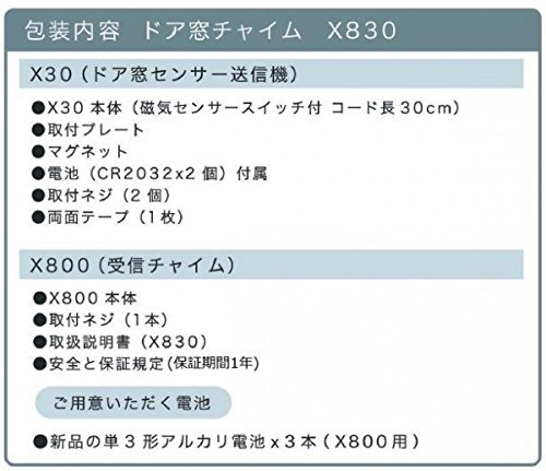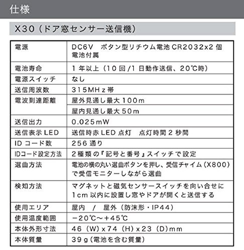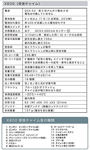 - 侵入感知や徘徊するお年寄りの検知にも使えるチャイム。 ドアや窓が開くとマグネットセンサーが感知し、離れた場所にある受信機が光とチャイム音でお知らせします。送信機は防沫形なので屋外の軒下などでも使えます。※受信機(X800)には電池が付属しておりません。 サイズ 個装サイズ:23×16×4cm 重量 個装重量:190g 素材・材質 ABS樹脂 製造国