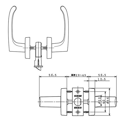 ●メーカー名川口技研 室内用レバーハンドル錠 ●仕様 対応ドア厚29~45mm ●材質 ハンドル・座:アルミ合金 ラッチ:亜鉛ダイカスト