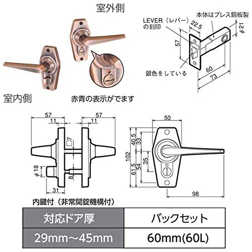 ●メーカー名川口技研 室内用レバーハンドル錠 トイレ用 ●仕様 B/S:60mm 対応ドア厚29~45mm ●材質 ハンドル・座:亜鉛ダイカスト ラッチ:プレス鋼板