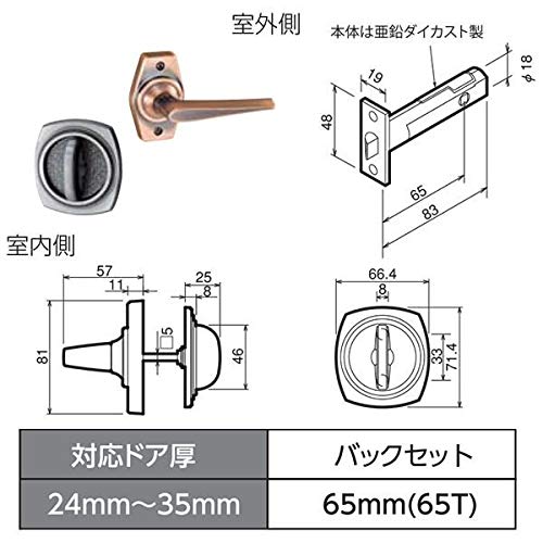 ●メーカー名川口技研 室内用レバーハンドル錠 和室用 ●仕様 B/S:65mm 対応ドア厚24~35mm ●材質 ハンドル・座・ラッチ:亜鉛ダイカスト 戸襖ツマミ・座:プレス鋼板