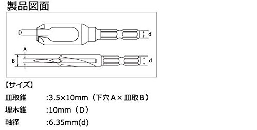 - 下穴あけと皿取が1本で行える、共木でダボが作れる。 皿取錐で皿を取ることでビス頭がキレイにおさまるので美しい仕上がりになります。皿取錐はビスの下穴あけと皿取加工が一度の作業で行えます。埋木錐は共木でダボが作れるので、埋めたあとが目立たず美しい仕上がりになります。 サイズ 皿取錐:3.5×10mm(下穴A×皿取B)、埋木錐:10mm(D)、軸径:6.35mm(d) 個装サイズ:16×7×3cm