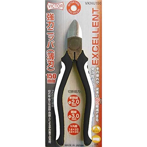 - ●型番VKNU150 ●ご注意事項 ・この商品は下記内容×10セットでお届けします。 ・パンフレット画像に記載の「入数」はあくまでパンフレット上の表記であり、実際のお届け個数とは異なります。 プロ仕様の機能!切れ味・耐久性抜群・熟練工による手作業での刃付け!薄刃!銅線・VA線・軟鋼線等の切断に最適。●切断能力 鉄線φ2.0/銅線φ3.0/VA線 φ1.6x2芯・φ2.0x2芯各種径の表記まで切断可能 ●H169mmxW53mm