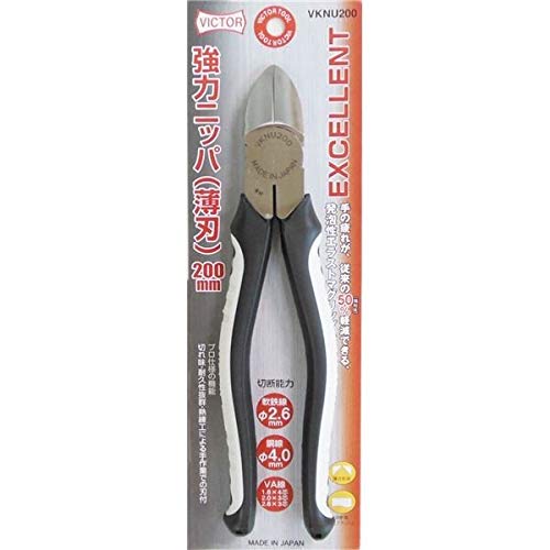 - ●型番VKNU200 ●ご注意事項 ・この商品は下記内容×10セットでお届けします。 ・パンフレット画像に記載の「入数」はあくまでパンフレット上の表記であり、実際のお届け個数とは異なります。 プロ仕様の機能!切れ味・耐久性抜群・熟練工による手作業での刃付け!薄刃! 銅線・VA線・軟鋼線の切断に最適●切断能力 鉄線φ2.6/銅線φ4.0/VA線 φ1.6x3芯・φ2.0x3芯・φ2.6x3芯各種径の表記まで切断可能 ●H216m