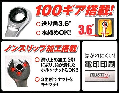 - 造国 台湾 100ギア搭載・送り角3.6度!!狭所の作業も楽々!! ギアレンチ部は驚きの100ギア搭載、送り角は3.6度!!72ギアでも取り回しできなかった狭所での作業が可能になりました。スパナ部はノンスリップ加工により3か所でナットをしっかりとキャッチする事ができるので、力がボルト・ナットに伝わりやす