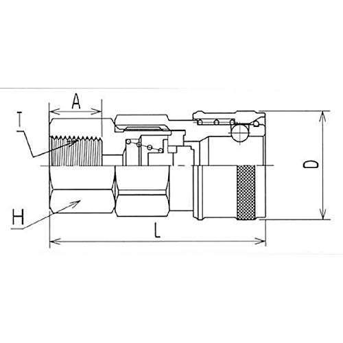 - 状:ソケット・メネジ ■最高使用圧力(kg/cm2):15(20MPa) ■耐圧力(kg/cm2):1.5(2.0MPa) ■シール材質:ニトリルゴム(NBR) ■使用温度範囲(℃):-20~+80 ■適用流体:空気・油他 ■取付け側形状:R1/4”オネジ ■全長(L;mm):49.5 ■寸法A(mm):13 ■寸法D(mm):φ25 ■対辺(H;mm):19 ■寸法T(”):Rc1/4