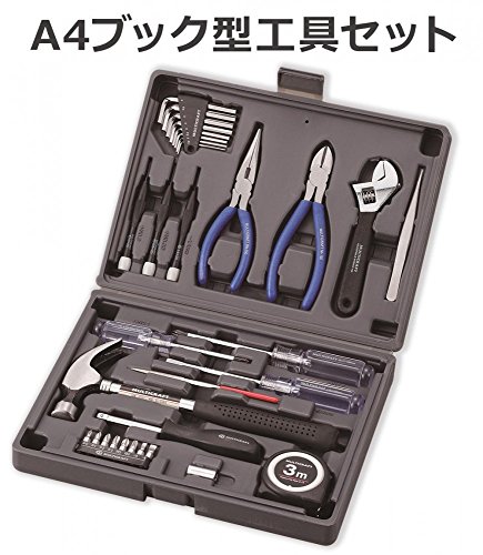 - 便利に収納できるA4ブック型工具セット 書庫やロッカーなどのちょっとしたスペースに収納できるA4ブック型の工具セットです。はめこみ型のケースなので、パーツの紛失もしにくくなっています。日曜大工からちょっとしたメンテナンスなど、日常のシーンで役立つツールが入っています。 サイズ 個装サイズ:30×22×6cm 重量 個装重量:1850g 素材・材質 ポリエチレン