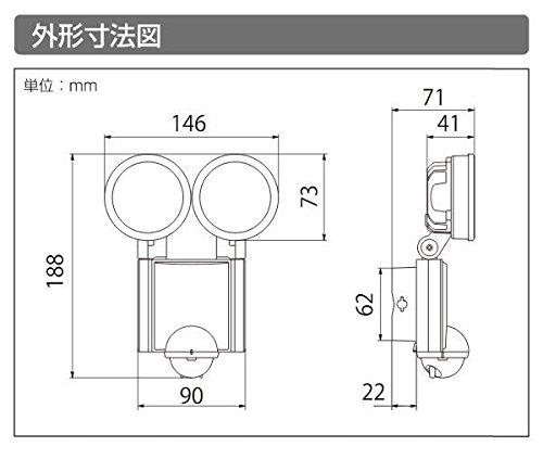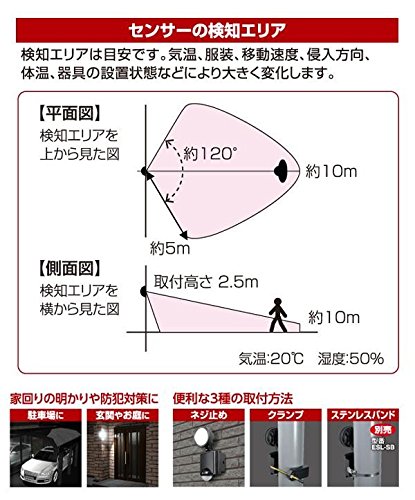 - 5cm 重量 個装重量:885g 付属品 取付ネジ2本、コンクリート用スリーブ2本、マスキングカバー1個、クランプ1セット、取扱説明書、保証書(保証期間1年) 製造国 中国 センサーが人や車の動きを検知して自動点灯。