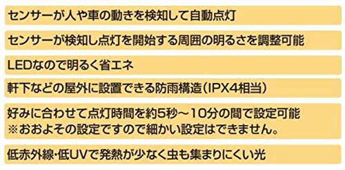 - 屋外用のLEDセンサーライトです。センサーが人や車の動きを検知して自動点灯。軒下などの屋外に設置できる防雨構造(IPX4相当)。点灯開始照度(センサーが検知を開始する明るさ)の設定ができます。好みに合わせて点灯時間を約5秒~10分の間で設定できます。(※おおよその設定ですので細かい設定はできません。)防犯にオススメ! fk094igrjs