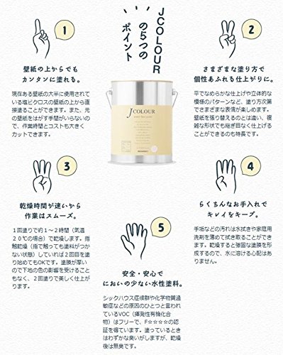 - 水性(乾燥後:耐水性) ■塗布面積(2回塗り):20~25m2 ■乾燥時間:1~2時間 ■F☆☆☆☆認定商品 (社)日本塗料工業会登録:T02003 製造国 日本 壁紙の上からでも簡単に塗れるインテリアペイント♪ ※モニターの設定などにより、実際の商品と色味や素材の見え方が異なる場合がございます。あらかじめご了承ください。