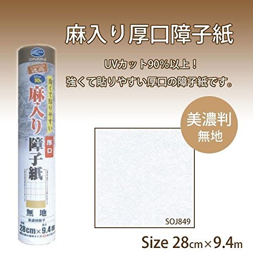 - 紫外線90%カット 強くて貼りやすい厚口の障子紙です。腰板付き障子2枚分貼れます。 サイズ 28cm×9.4m 個装サイズ:6×6×25cm 重量 約160g 個装重量:160g 素材・材質 パルプ(60%)、合成繊維(20%)、レーヨン(10%)、ビニロン(10%) 仕様 糊・両面テープで貼るタイプ 美濃判 製法:機械すき 蛍光剤配合
