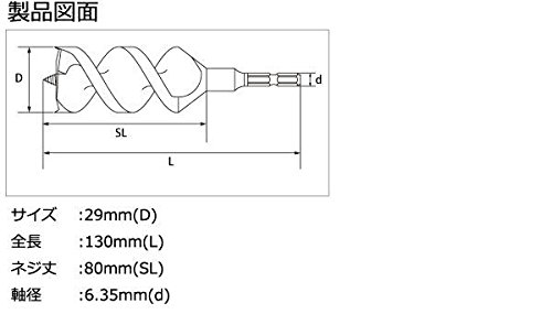 - mm(SL)、軸径:6.35mm(d) 個装サイズ:19×5×3cm 重量 個装重量:132g 素材・材質 普通鋼 仕様 適用材:一般木材 適用機種:インパクトドライバ、電気ドリル 適正回転数:3000回転/分以下 対応軸タイプ:六角軸 製造国 日本 インパクトドライバでの浅い貫通穴あけに!