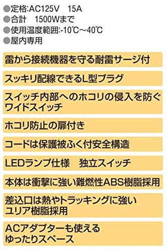 - 球切れの心配の少ないLEDランプ仕様。 雷から接続機器を守る耐雷サージ機能付きの、スイッチ付タップです。 サイズ 個装サイズ:34×11×5cm 重量 個装重量:520g 製造国 中国 球切れの心配の少ないLEDランプ仕様。 雷から接続機器を守る耐雷サージ機能付きの、ス
