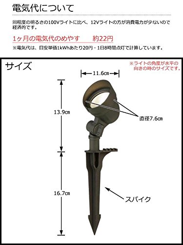- 防雨仕様のガーデンライト。 ミディアムな範囲をやわらかく照らす、防雨仕様のスポットライトです。縦方向の首振りが可能です。 サイズ W76×D116×H139mm 個装サイズ:15×11×21cm 重量 個装重量:500g 素材・材質 アルミダイキャスト 仕様 4.5WLED 色温度:3000K(電球色) 全光束:205ルーメン 電圧:12V 定