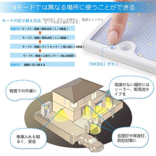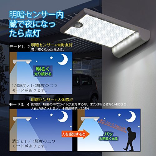 - 【四つの知能モード】 必要によって、取り付けの前にモードを選択下さい。 ☀①25%のライト常時点灯モード:暗くなると、自動点灯し、蓄積した電力が切れるまで強く明るい光を提供してくれます。 ☀②50%のライト常時点灯モード:暗くなると、自動点灯し、蓄積した電力が切れるまで強く明るい光を提供してくれます。 ☀③DIMライトセンサーモード:暗くなるとライトは薄暗く点灯しますが、人が近づくとセンサー感知でライトが明るくなります。 ☀④センサーモード:普段は消灯しており、人が近づくとセンサー感知でライトが明るくなり、20秒強点灯して、自動的にオフにします。