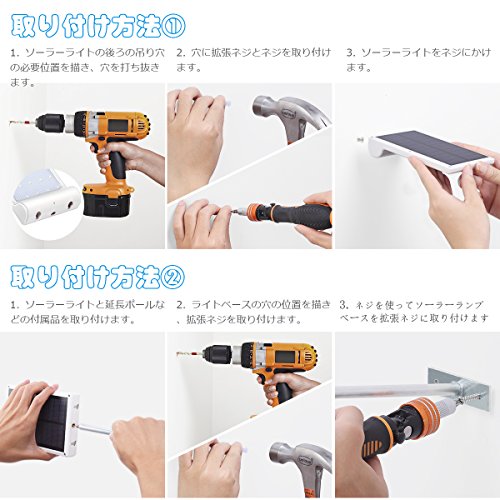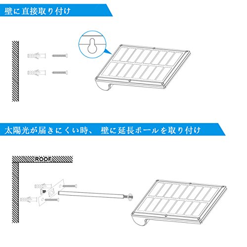 - 【科学デザイン】本体を直接壁に引っ掛けるまたは付属のアルミのポールで伸ばした状態での設置が出来るので日中の太陽の当たり具合で見てから行った方が便利です。【省エネ】 ソーラーパネルは昼間で太陽エネルギーを吸収し、電力に転換し、バッテリーに蓄え、夜に自動的に点灯します。電気代は要りません。