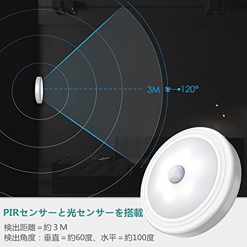 - ② 【夜間&人感センサー】検出の距離=約3M、検出角度は垂直=約60度、水平=約100度.敏感に周囲の動きを感知できます。PIRセンサーと光センサーが付き、人感センサーライトは暗い場所で自動点滅できます。人の動作を感知しますと、自動点灯します。人が離れると、約20秒自動消灯です。夜間と暗い場所だけ点灯します。電力消費を節約します。