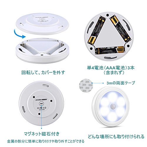 - ③【簡単な取り付け、配線ないデザイン】:単4電池3本使用して3mの両面テープも付き、どんな場所にも取り付けられます。ご注意:電池が含まれず。電池を取り付けるとき、陰陽両極を逆にしないでください。マグネット付き、3M両面テープ付き電池式ライトなので、金属の表面にも設置可能になります。工事が不要で、簡単で取り付けます。クロゼット、タンス、本棚、押し入れなどのような場所にも適合です。手のひらサイズですが明るさは十分です。