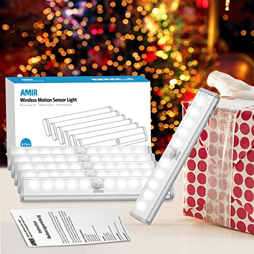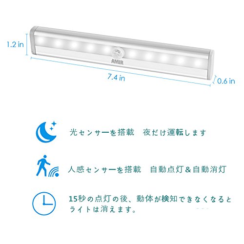 AMIR LED センサーライト 10灯 人感センサー 電池式 自動点灯 消灯 キッチンライト 磁石&粘着テープ 簡単に取り付け ワイヤレス 省エネ 高輝度 玄関 廊下 階段に最適 6本入り 昼白色