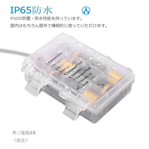 - ③【リモコン搭載】リモコンは3xAA電池で供電なので使う場所を選びません。また、細いワイヤーなので手軽に簡単に好きな形にできます。また、明るさを感知するセンサーが搭載されていますので、辺りが暗くなると自動で点灯・消灯します。