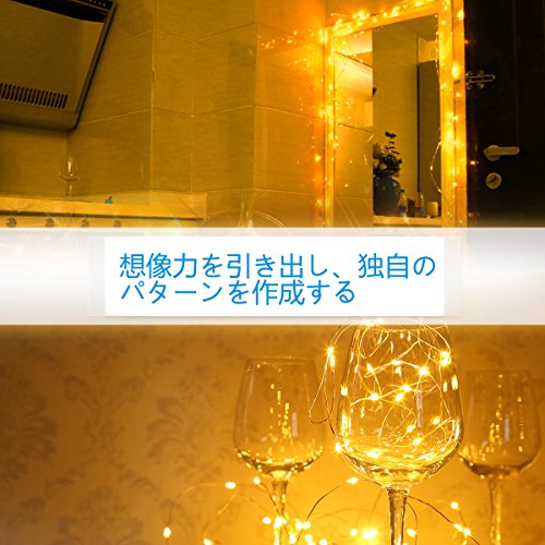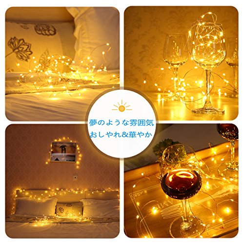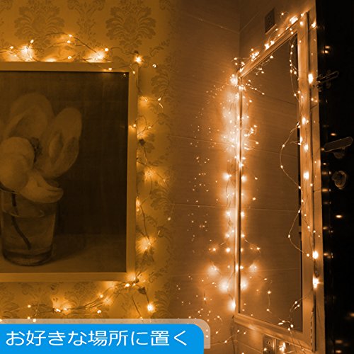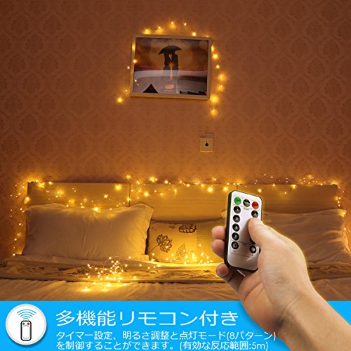 - ①【多機能リモコン付き、幻想的な雰囲気】小さなLEDが等間隔に付いたイルミネーションライトです。線は細いので目立なく、素材は銅線ですので好きな形を手軽に作ることができます。飾り付けも簡単、LEDの明るさやデザインを利用して良い雰囲気を醸し出しましょう!さらに本機は5メートル以上の長さで50LEDを搭載、広く飾ることができます。さらにさらにMODEのボタンを押すたびに点灯パターンが切り替わります。全部で8パターンの光の演出を楽しむことができます。そして、タイマー設定機能付け、自動的に6時間オン、18時間オフことができます。