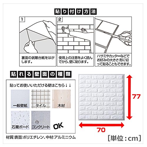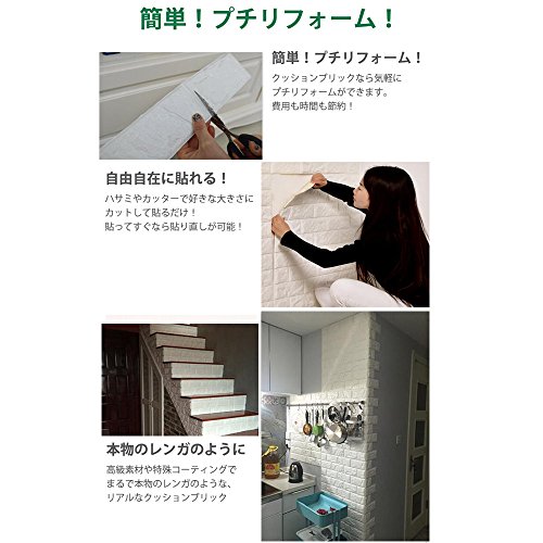 - 【商品特性】クッションタイプのブリック壁紙です。シールタイプなので施工も簡単。無塗装し、無ツールし、自己粘着なので、簡単に綺麗に壁に貼ってはがせます。数分以内に装飾完成します。クッションタイプでやわらかいので、子供部屋など危険がある生活空間で、クッションガードとして安全に使用することができます。お手頃価格なので、プレゼントにもオススメです!