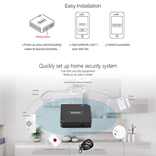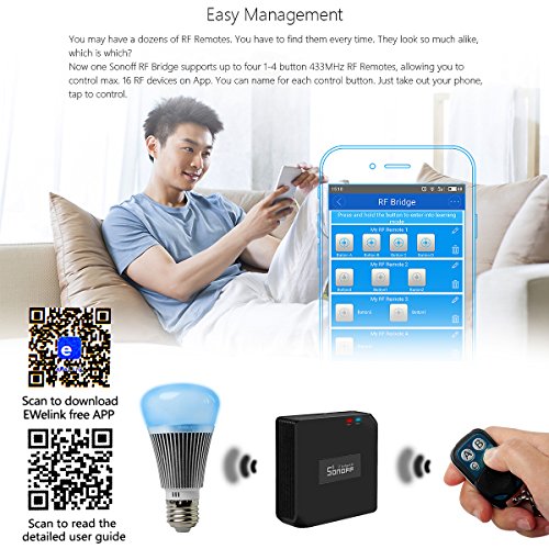 - iOS/Android App eWeLinkにRFワイヤレスブリッジを追加した後、1-4個のボタンの433MHz(4個の433MHzコントロールは合計16個のボタンを超えることはできません)のワイヤレスRFリモートを4つまで追加することができます。RFブリッジデバイスへのワイヤレスRFリモート。 WiFi/2G/3G/4Gネットワークを介してアプリケーション上の433MHzのRFデバイスを制御します