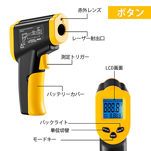 - 使用範囲 :室内と室外に使える放射温度計、操作も簡単で、電気基盤、エンジンやタイヤ、各種機械、加熱・冷却装置、食品、液体や油、気体等高温、有害および接触できない目標物の温度測定でき、とても便利です。