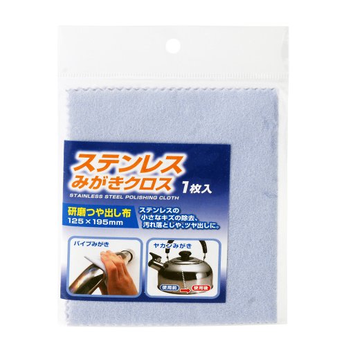 ●パッケージサイズ/縦:160mm横:108mm高さ:5mm●パッケージ重量:12g●生産国:日本●材質:組成:綿布・超微粒子研磨材・ワックス・高級脂肪酸●用途:ステンレス製品の小さなキズの除去・汚れ落とし・ツヤ出し●サイズ:125×195mm●入数:1枚●研磨つや出し布●使用方法:汚れ等気に部分を軽く丁寧にみがいてください。みがき終わったらやわらかい綺麗な布かティッシュペーパーで充分から拭きしてください。みがくとステンレスみがきクロスが黒くなりますが、効力はほとんど変わりません。水洗いすると有効成分が溶け出しますので水洗いはできません。特に汚れがひどい時は、少量の水を本品に直接スプレーして使うとみがく力が強くなります。●注意:お肌の弱い方は薄い手袋をはめてご使用ください。メッキ製品は皮膜が薄いのでみがき過ぎないようご注意ください。ご使用方法を誤ると、ミガキ目が入る事があります。予め試してからお使いください。下記の場合はみがかにようご注意ください。新品及び新品同様の光沢があるもの・サテン仕上げ・梨地仕上げ等ツヤ消しを施したもの。