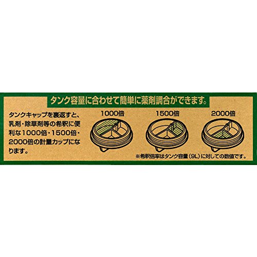 ●水入口キャップを裏返すと、乳剤・除草剤等の希釈に便利な1000倍・1500倍の計量カップになります。●スピードのある霧(到達)とソフトな霧の(拡散)がノズル先端で調整できます。●製品重量:1700g●パッケージサイズ/縦:175mm横:280mm高さ:485mm●パッケージ重量:1982g●生産国:日本●内容量:9L●用途:農薬散布用●本体寸法(約):高さ425mm×幅275mm×奥行き150mm●質量1.7kg●標準付属品:1頭口ノズル付伸縮式パイプ、レバーコック付噴霧ホース(直径5mm×1.2m)●ノズルパイプ:3段伸縮式1300mm●噴霧量:0.48l/min(0.3MPa)