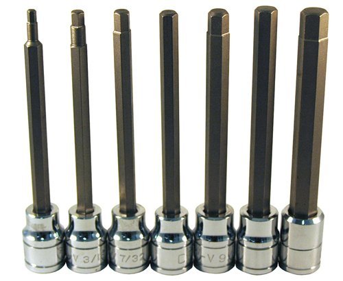 (7) Extra Long SAE Hex Bit Sockets: 1/8", 3/8" Drive (ATD-225). 3/16", 3/8" Drive (ATD-226). 7/32", 3/8" Drive (ATD-227). 1/4", 3/8" Drive (ATD-228). 9/32", 3/8" Drive (ATD-229). 5/16", 3/8" Drive (ATD-230). 3/8", 3/8" Drive (ATD-231). Extra long 4-1/2" shank for easy access to tight areas. Bits are made from S2 steel to meet or exceed torque specifications. Sockets are made from heat treated chrome vanadium steel for strength and durability.