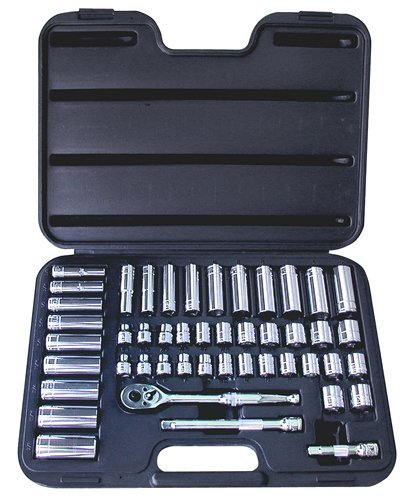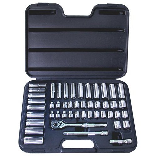The set contains (11) standard SAE sockets, (9) deep SAE sockets, (14) standard metric sockets, (10) deep metric sockets, (1) quick release ratchet and (2) extensions. It is manufactured of heat treated chrome vanadium steel and meets or exceeds ANSI specifications.