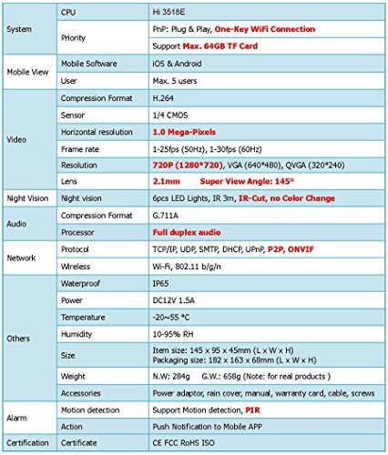 e-bell:ATZ-DBV01P; Waterproof: IP65; weight: N.W: 284g G.W.: 644g (Note: for real products ); size: 145 x 95 x 45mm; Power: DC12V 1.5A; Temperature: -20~55 °C; Humidity:10-95% RH Priority:PnP: Plug & Play, One-Key WiFi Connection. Support Max. 64GB TF Card